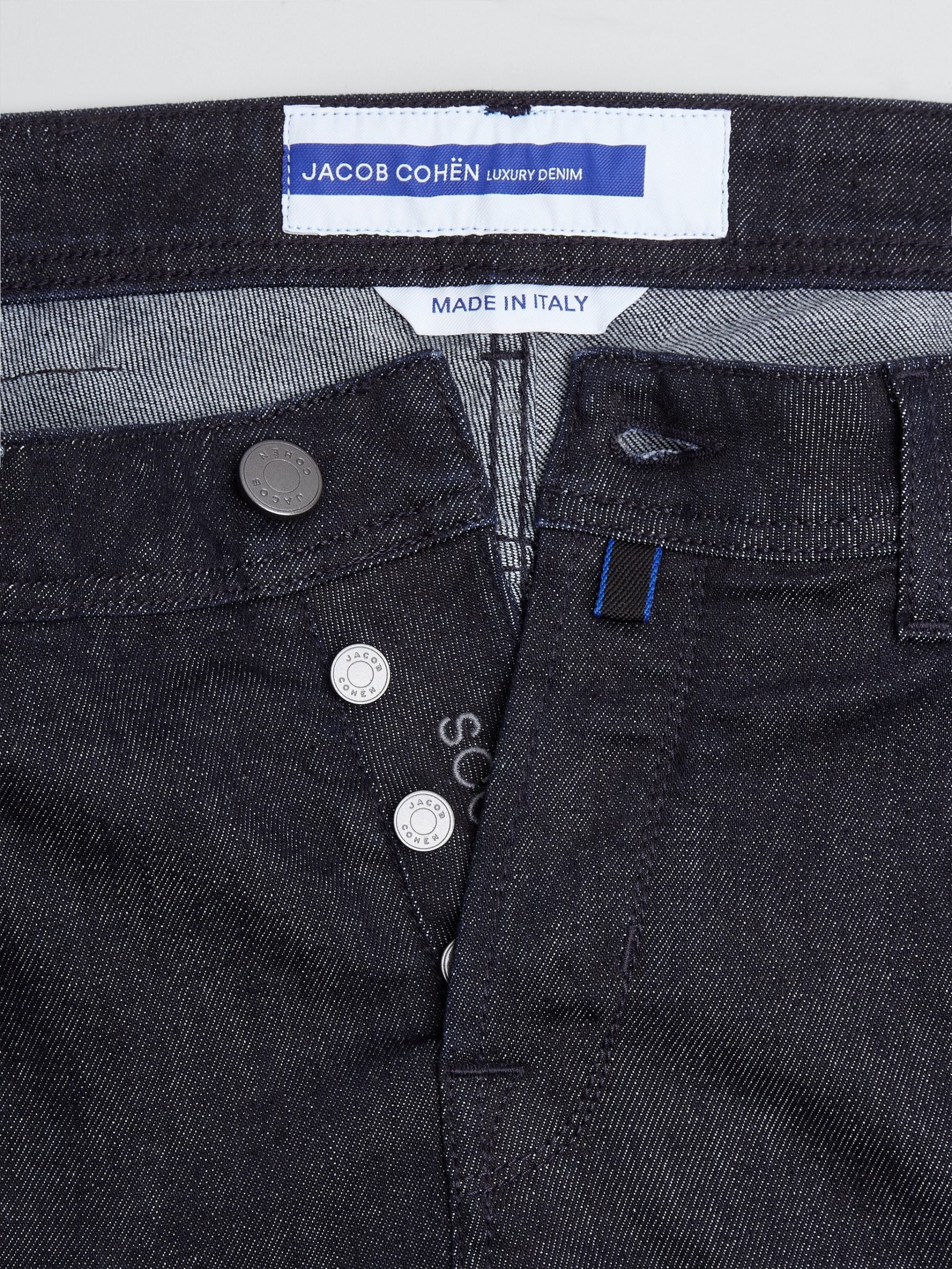Jacob Cohen denim, blue color, five-pocket design, suede patch on the back, button closure on the front, regular fit. Made in Italy